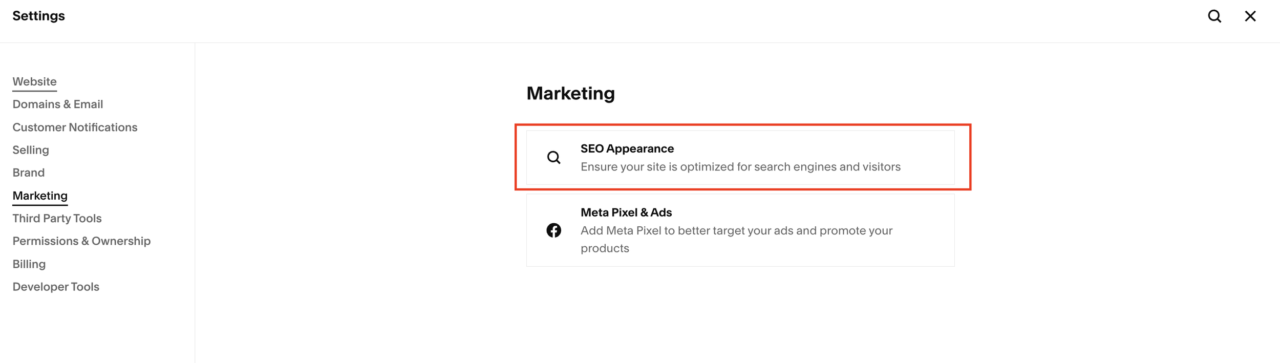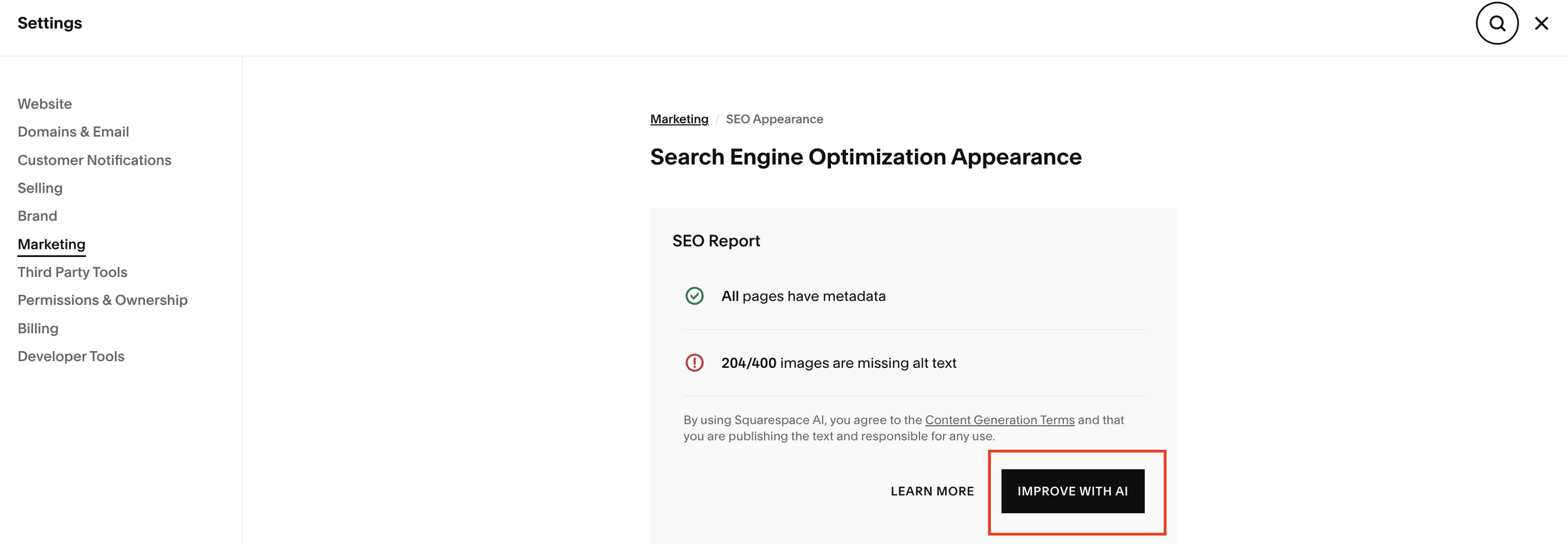 1. Navigate to Your SEO Settings. First, log into your Squarespace site and go to the Settings menu. From there, click on Marketing and then SEO Appearance. This is where you'll find Squarespace’s new AI tool that helps automate the process of adding alt text to images.