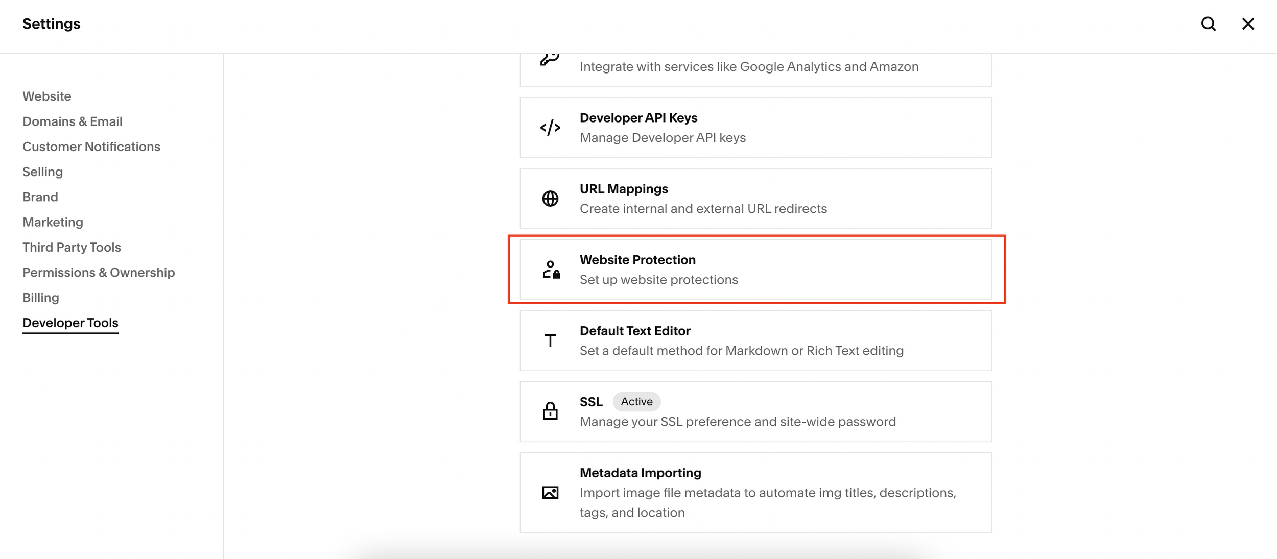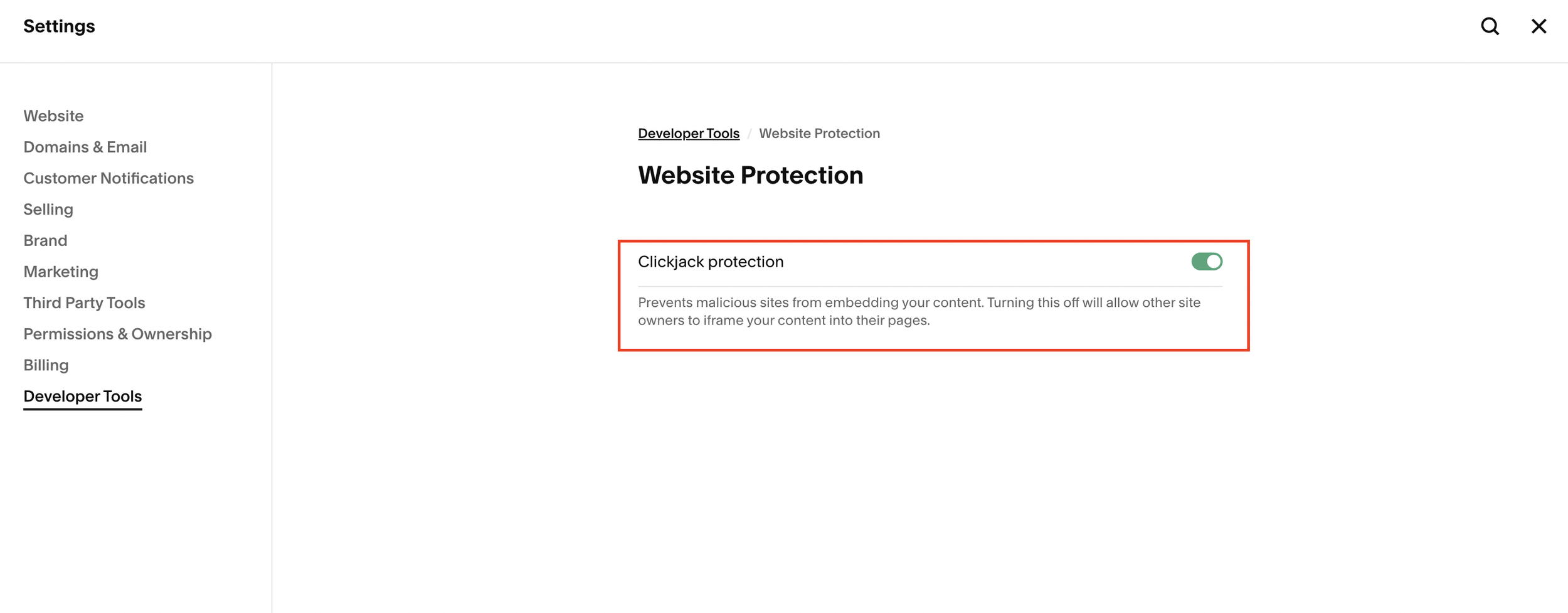 To protect your Squarespace website from clickjacking head to Settings > Developer Tools > Website Protection and here there’s just one option, Clickjack Protection.