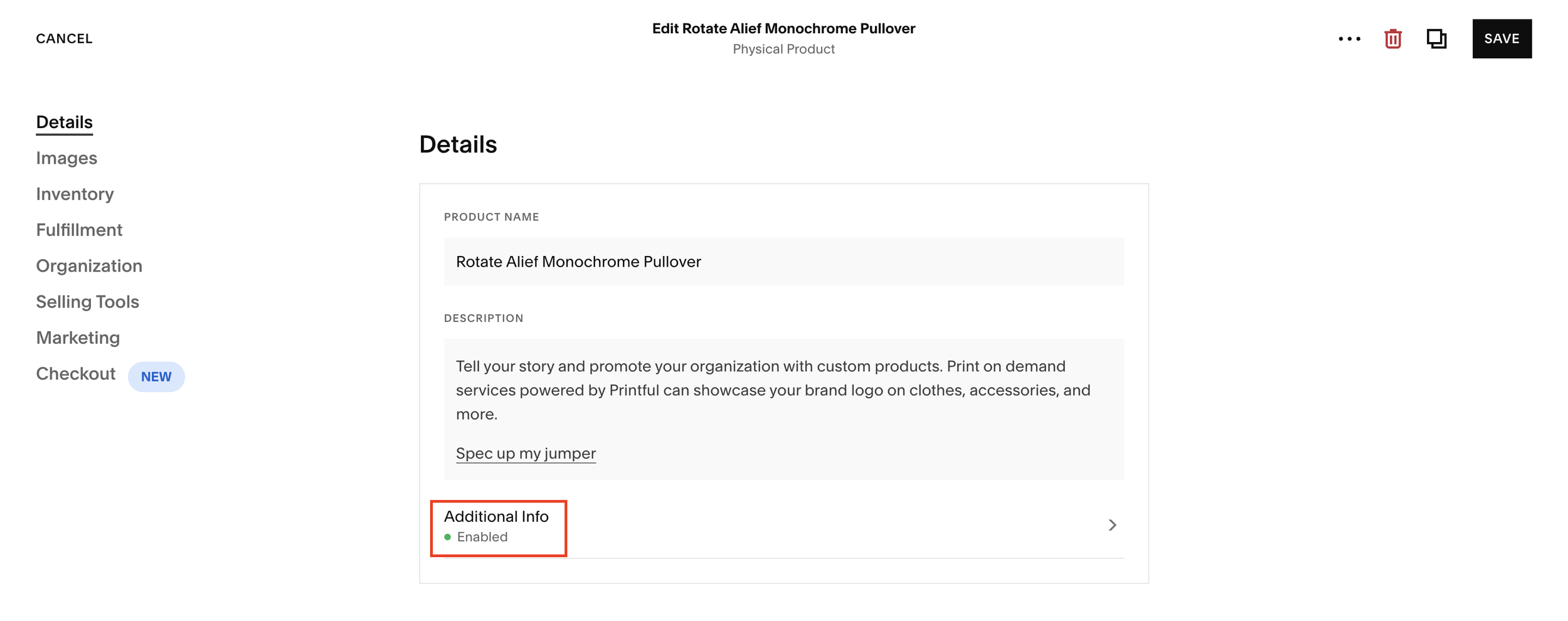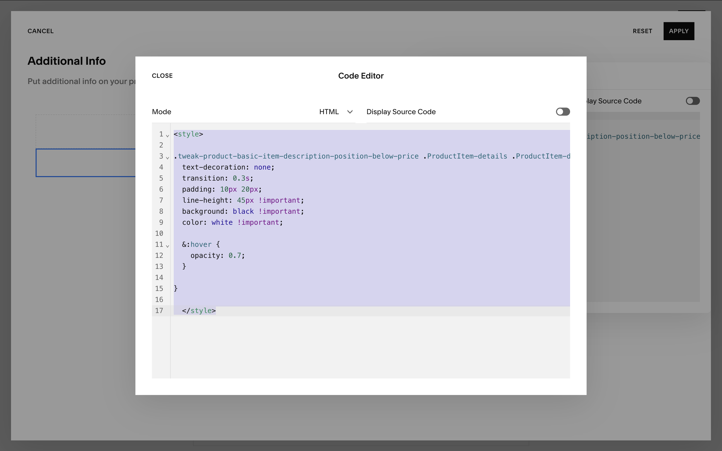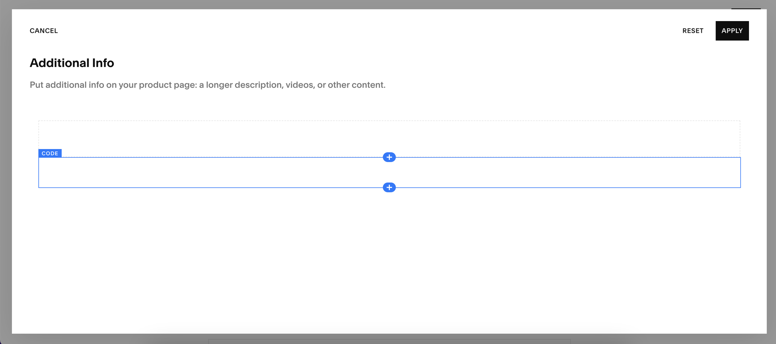 Next select the Additional Info section of the Edit Product dashboard and add a code block.