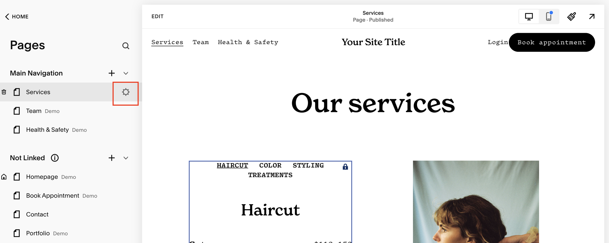 To hide a page from search engine crawlers simply click on the cog that appears next to the page in your page list to head to the page settings.