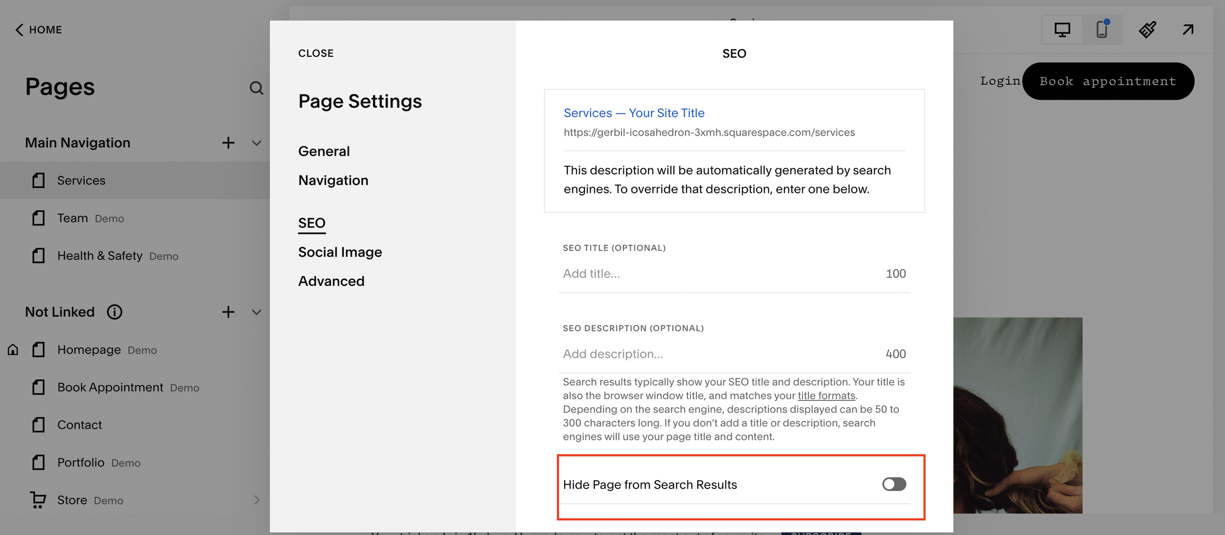 Within the settings panel select SEO and here you’ll see an option to “hide page from search results”.