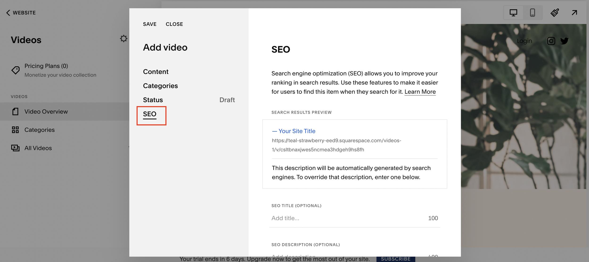 In the same left hand menu you can also select SEO and here you can change the SEO title and SEO description for the video page.