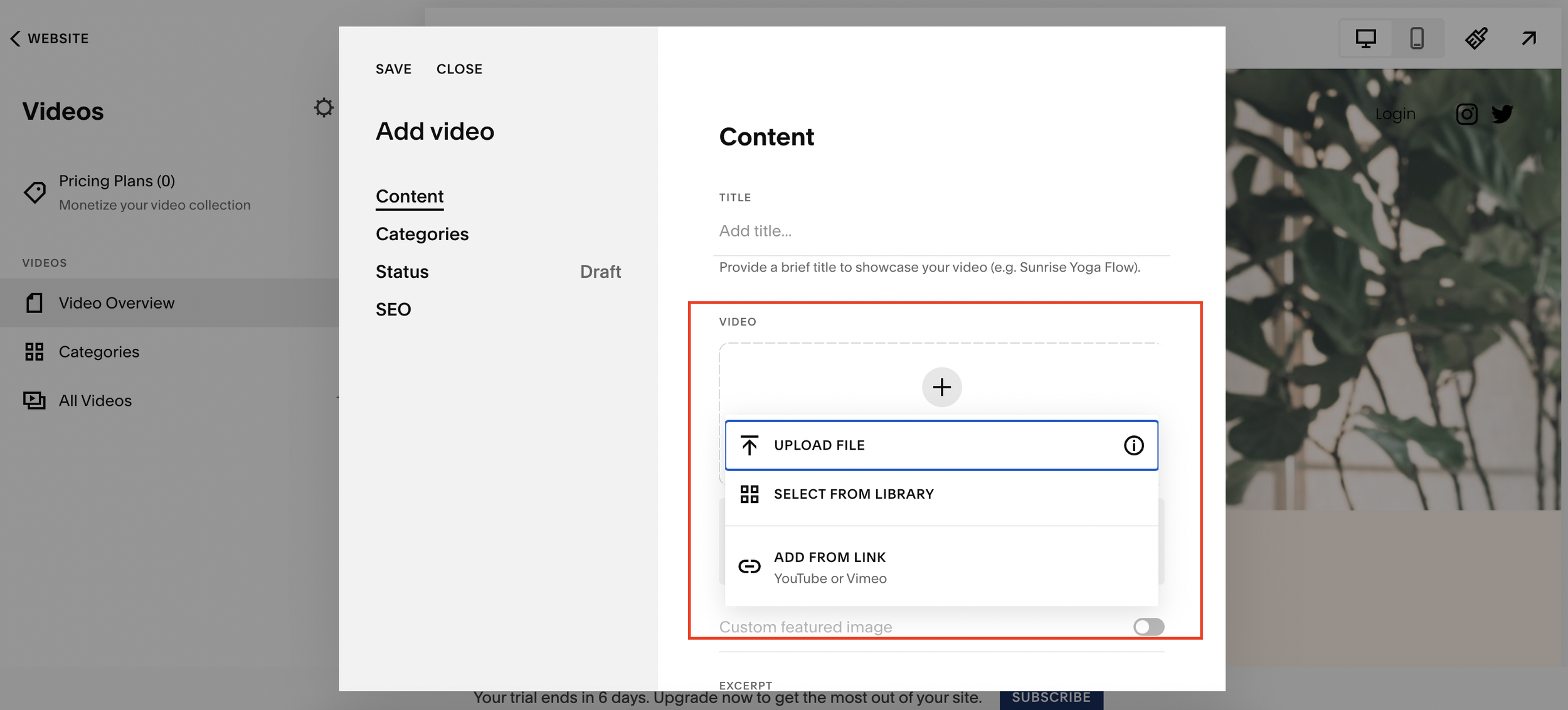 Select add video and you can either upload a file, select from your library if you’ve already uploaded the video to Squarespace, or use a YouTube or Vimeo link.