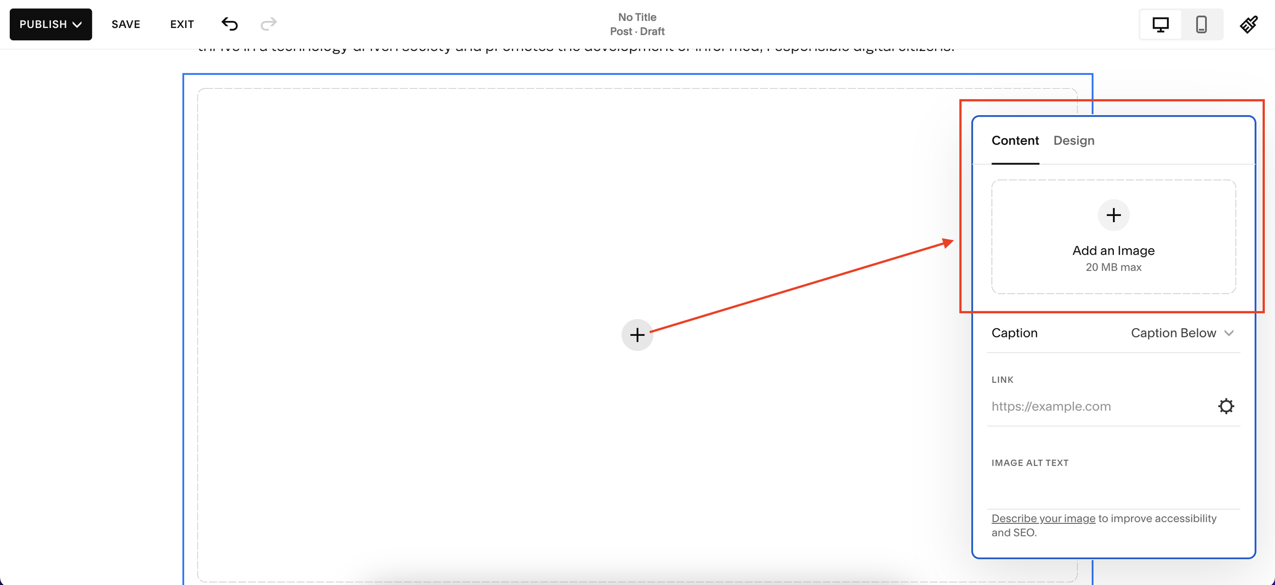 As you scroll through the content you’ll see that blue + icons appear in between every line. Head to the spot where you want to add your image and click the blue + icon.