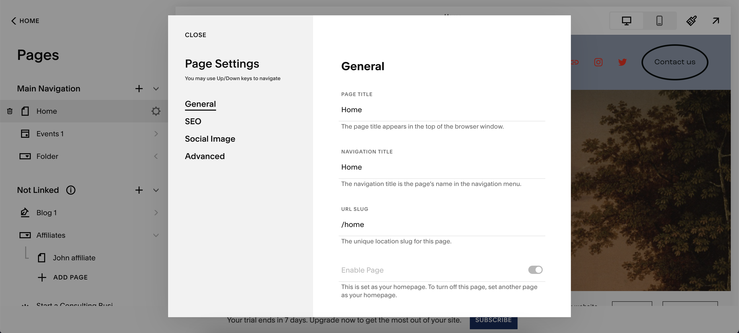 Within the General tab you can edit things such as the page title, navigation title, and URL slug and you can also undertake actions such as duplicating the page or setting a page as the homepage of your website.