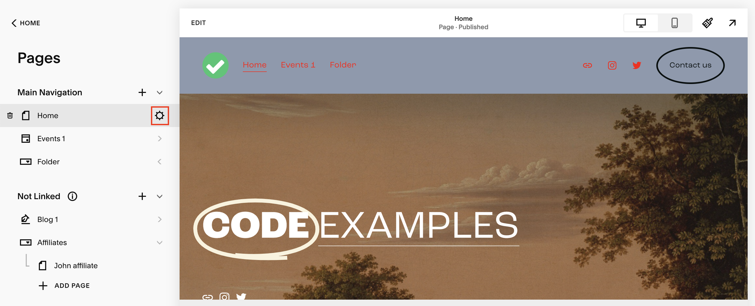 To edit the back end of a page, head to Websites and find the page you want to edit. Rather than opening the edit dashboard for this page, select the cog that appears next to the page name in the list.