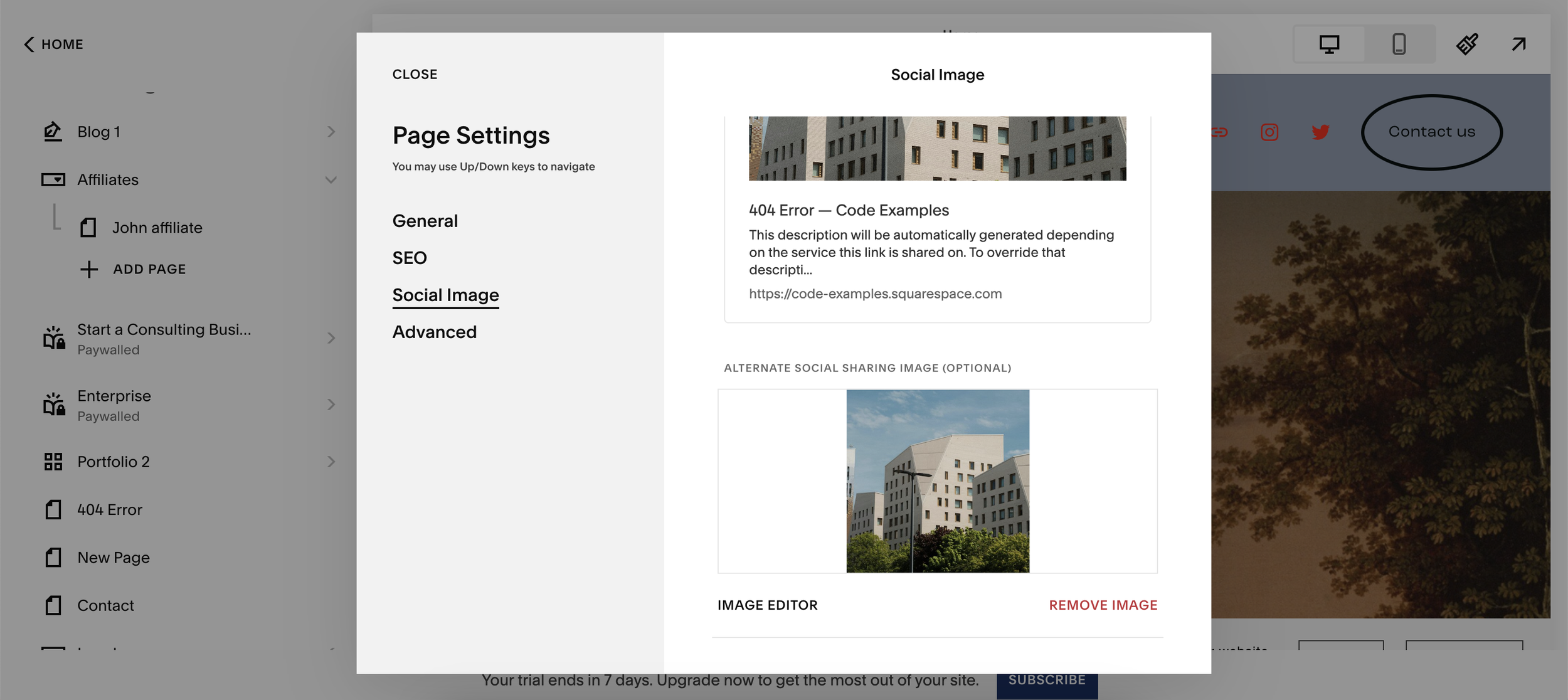 Within the social image tab you can change the image that’s used when the page is shared online, e.g. when the URL is embedded into a social media post.