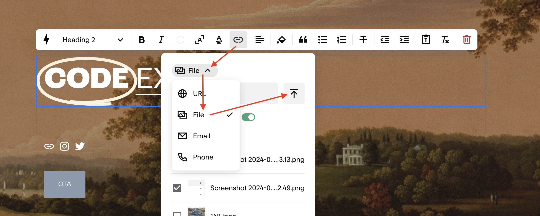 Head to the page you want to add your file to and ensure you’re in your edit dashboard. Double click the link that you want to use for your file access (this could be text, an image, or a button).