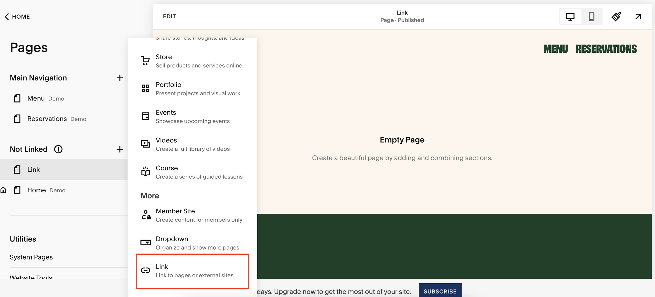 To link to your search page on Squarespace head to your pages list and click the + icon and select a Link page from the dropdown menu.