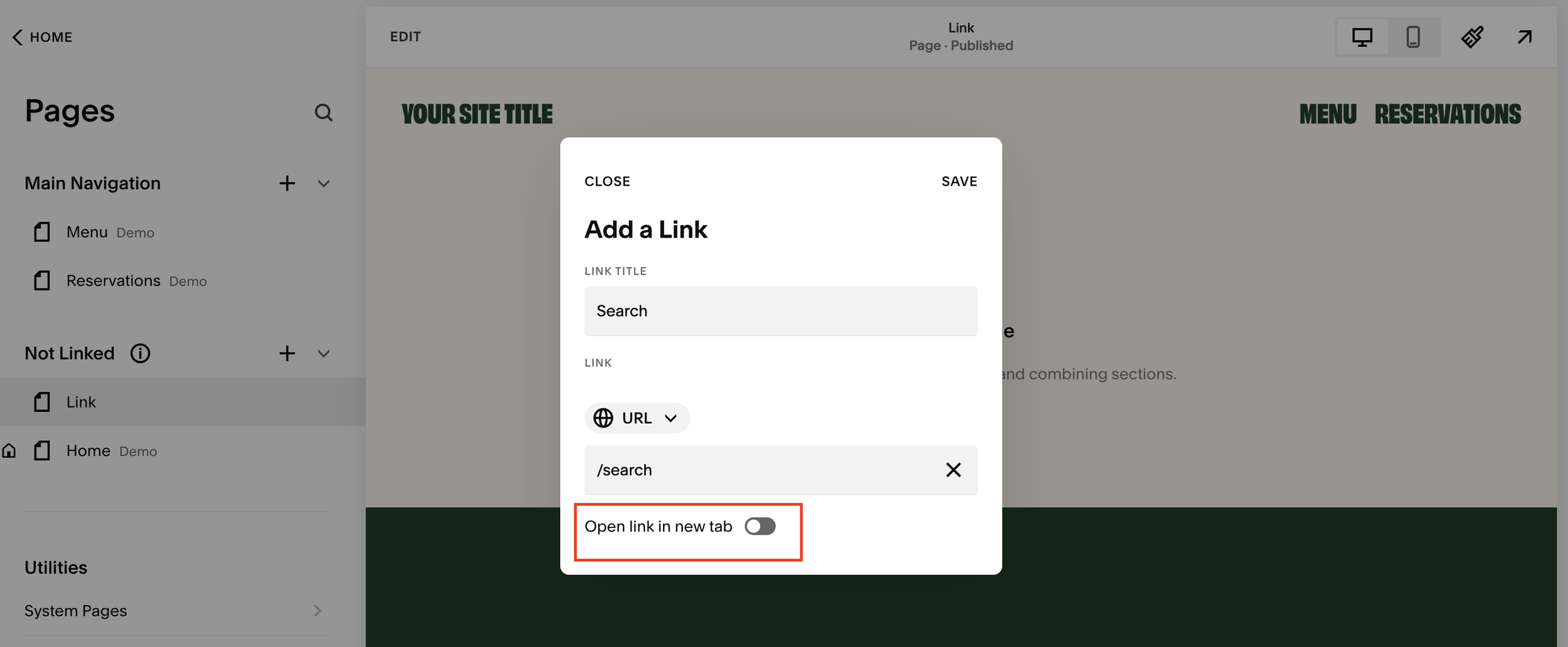Make sure you untoggle the option to open the link in a new tab and hit save. This will add a search page to your website and include it in the main header navigation.