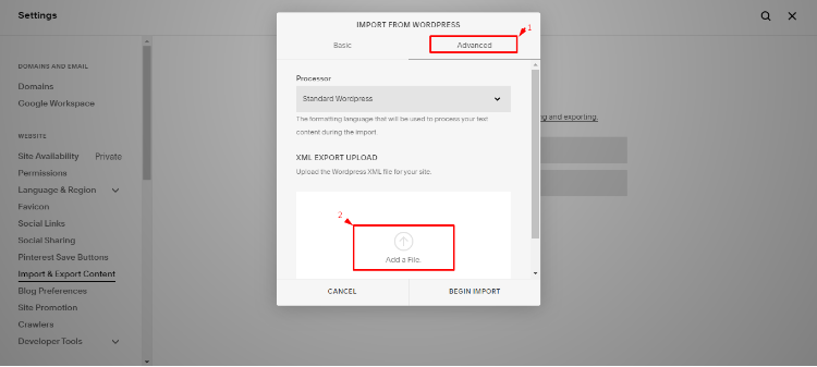 Upload the previously exported WordPress XML file and select “BEGIN IMPORT.” Depending on the size of your site, this process may take a few minutes.