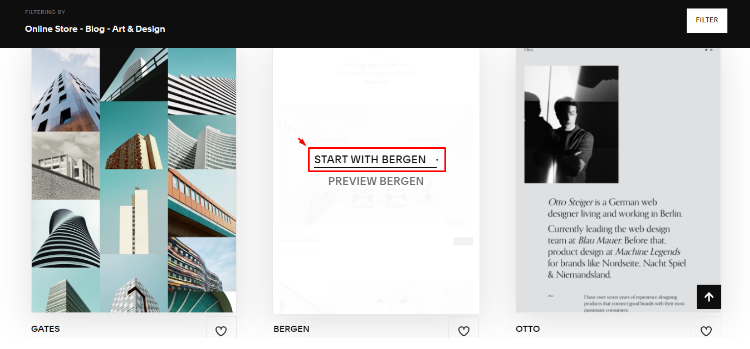 You can preview a template by hovering your mouse over it and clicking “PREVIEW [TEMPLATE NAME].” To use the template, click “START WITH [TEMPLATE NAME].”