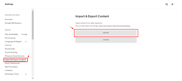 Navigate to “Settings” and select “Import & Export Content” under the “WEBSITE” section. Next, select the “IMPORT” option.