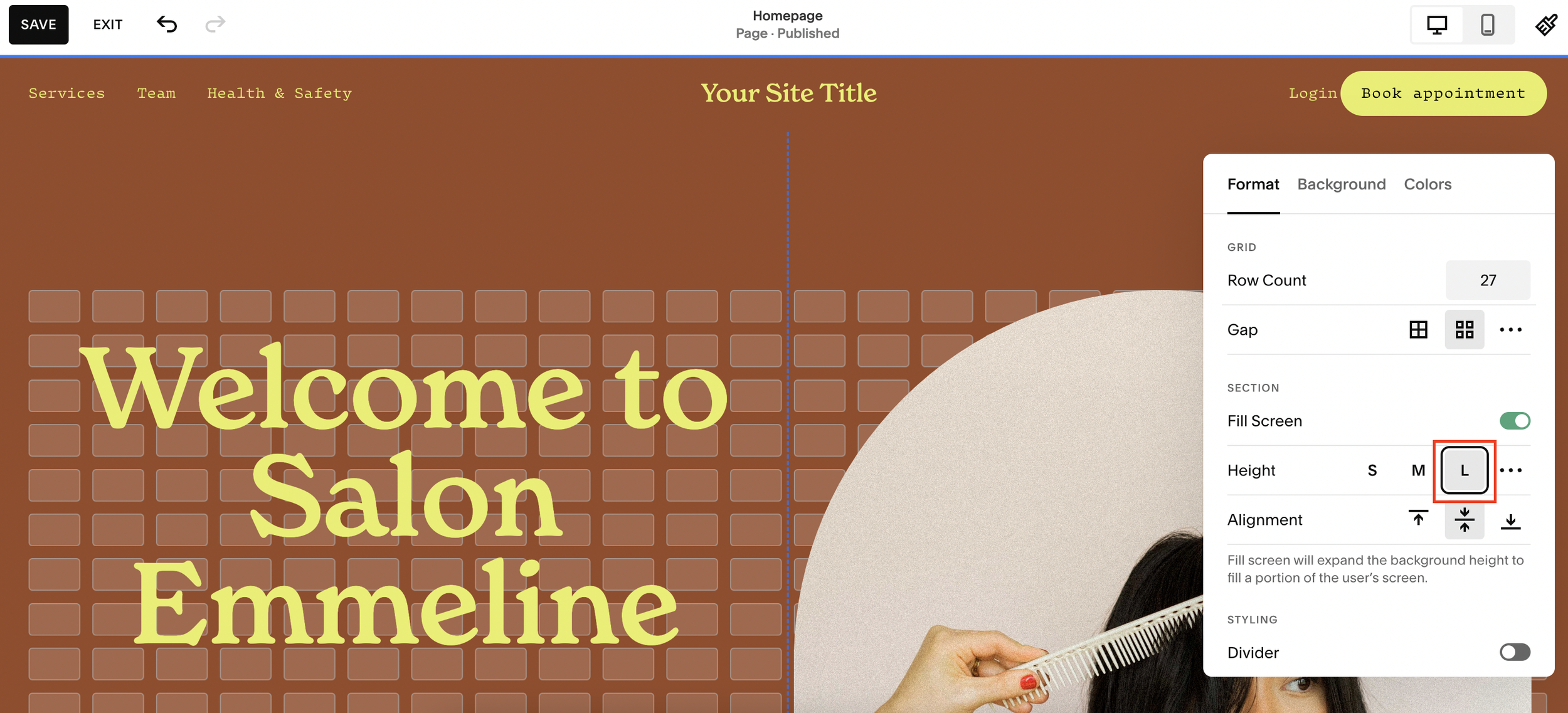 In the edit panel that appears, in order to make sure the section fills the screen and you don’t get the blank space at the bottom, you need to ensure you select large in the height section.