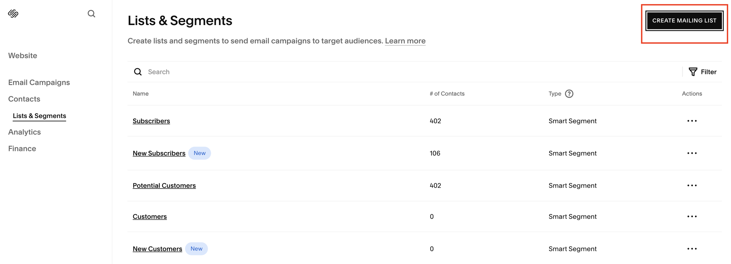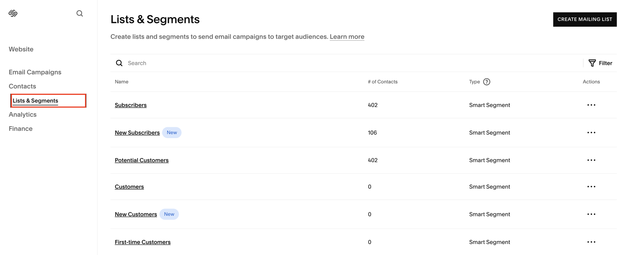 Under Contacts, select Lists and Segments to manage your subscribers.